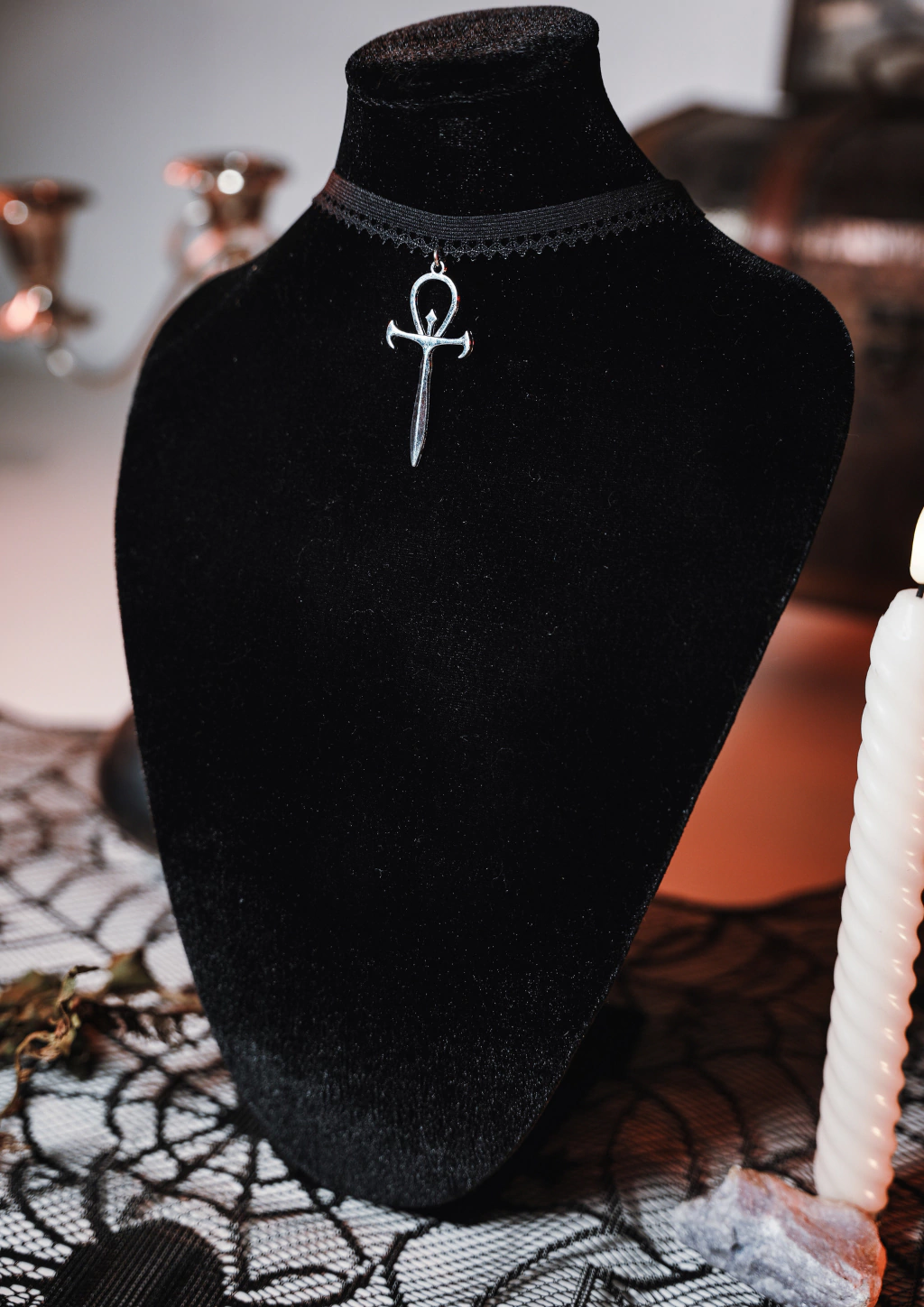 Choker elástico, dije cruz ANKH 40x17mm acabado en baño de plata tibetana, fabricado en metal de aleación.